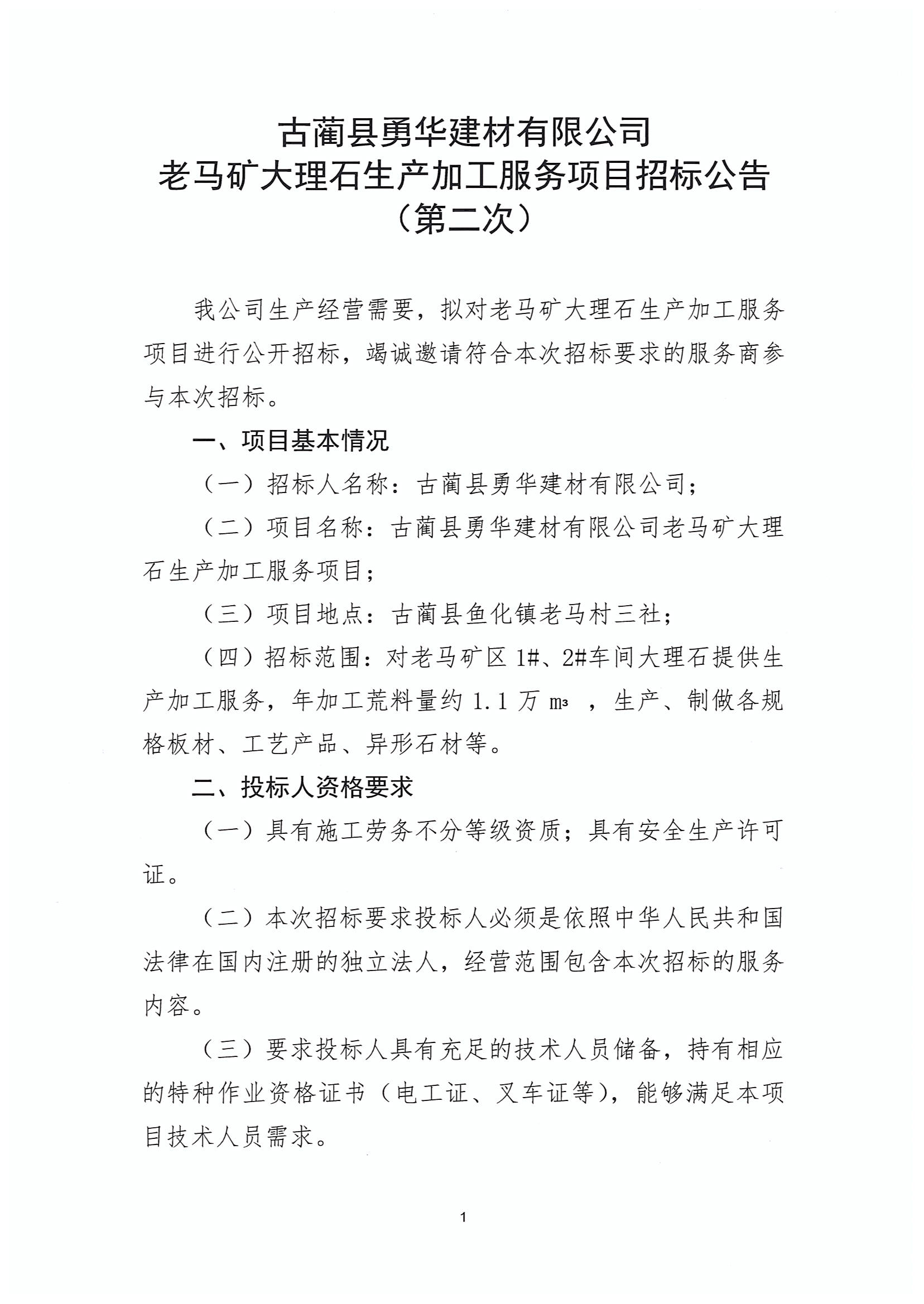 老馬礦大理石生產(chǎn)加工服務(wù)項(xiàng)目招標(biāo)公告(第二次)