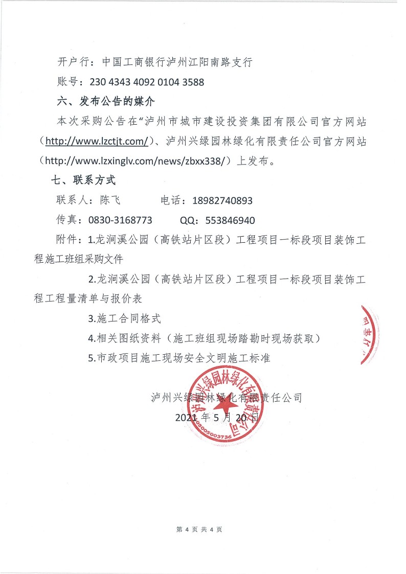 瀘州興綠園林綠化有限責任公司關(guān)于 龍澗溪公園(高鐵站片區(qū)段)工程項目一標段項目裝飾工程施工班組采購公告(第二次)