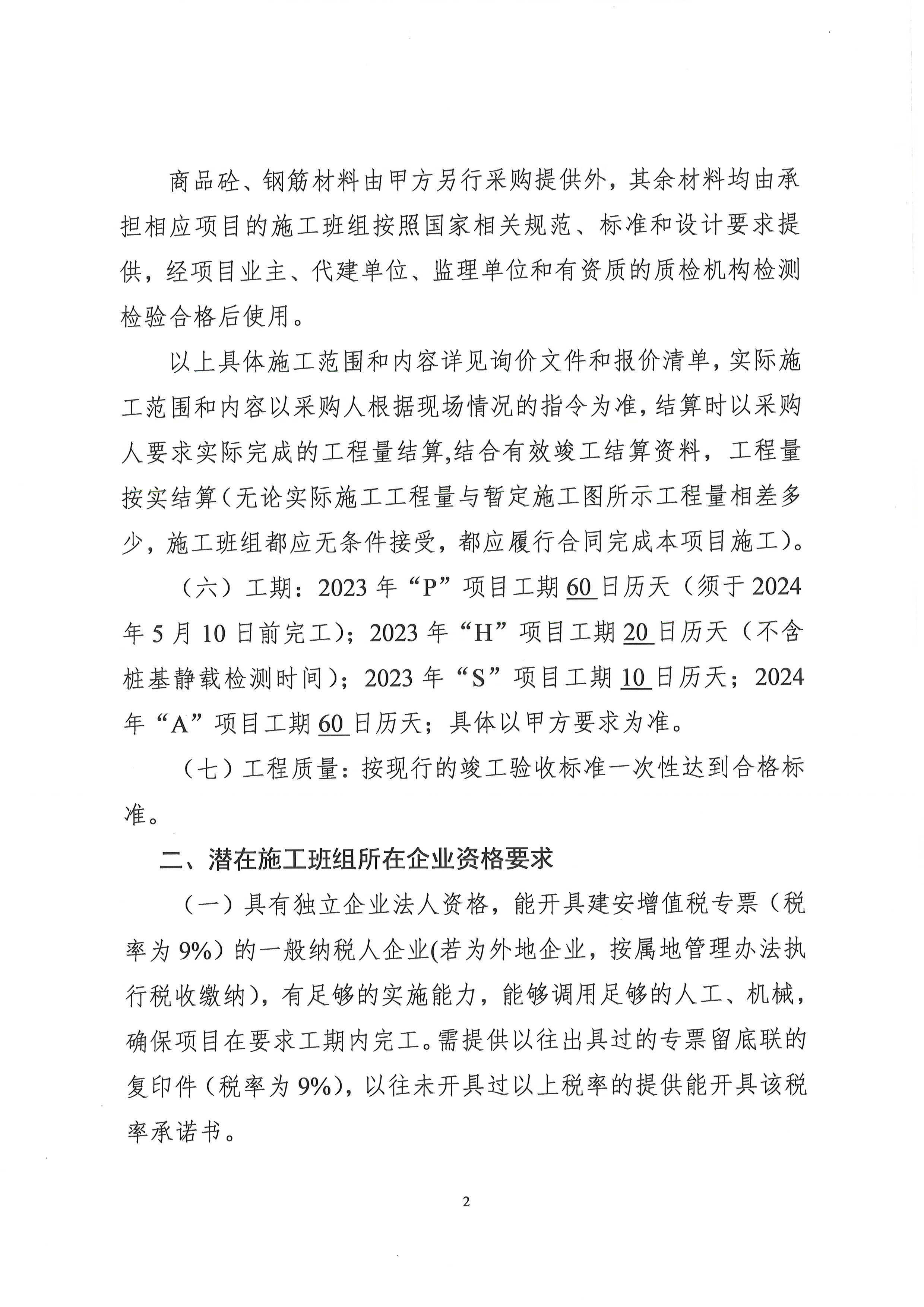 2023年“P”項目、2023年“H”項目、2023年“S”項目、2024年“A”項目樁基礎工程勞務施工班組詢價公告