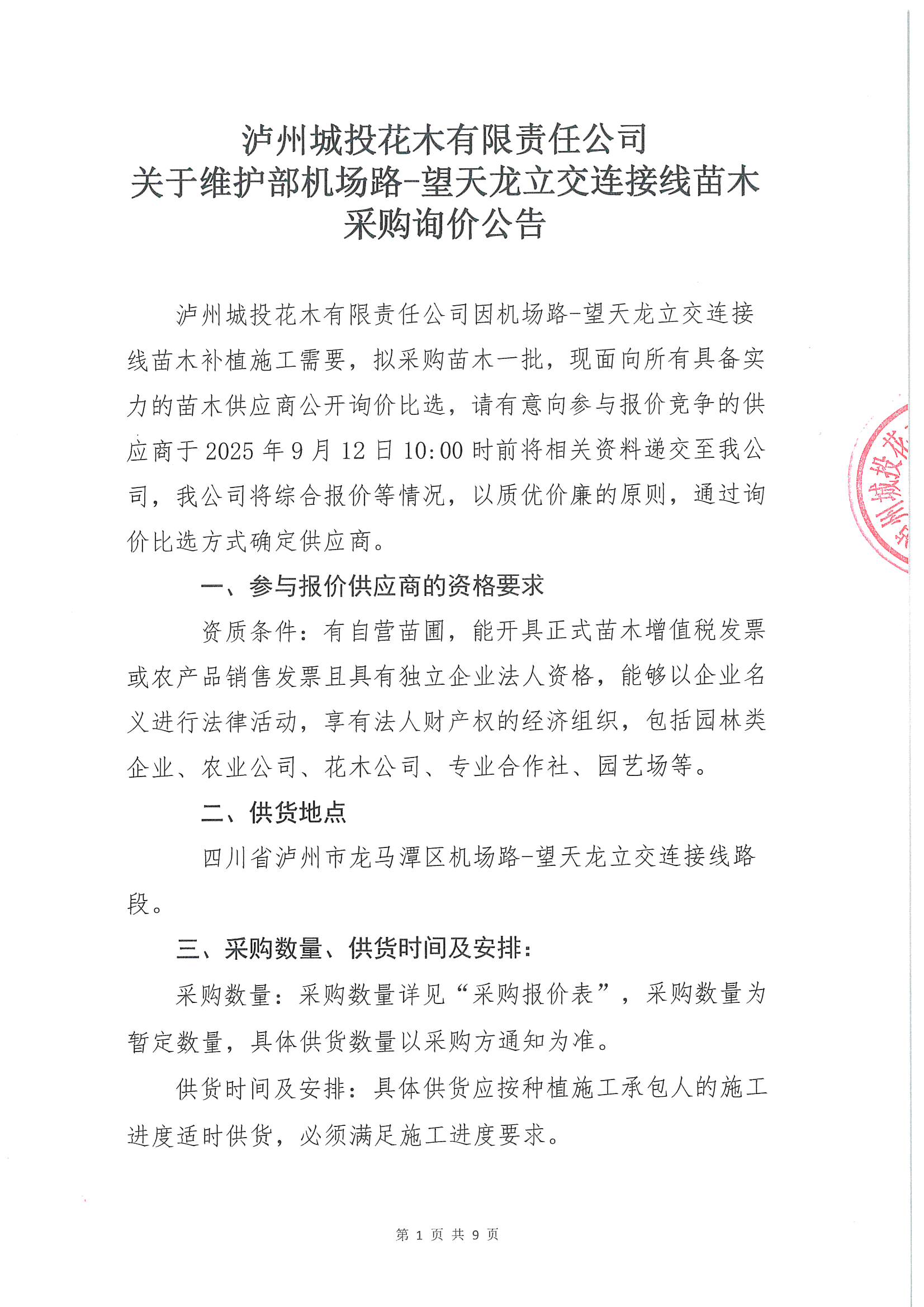 瀘州城投花木有限責(zé)任公司關(guān)于維護(hù)部機場路-望天龍立交連接線苗木采購詢價公告